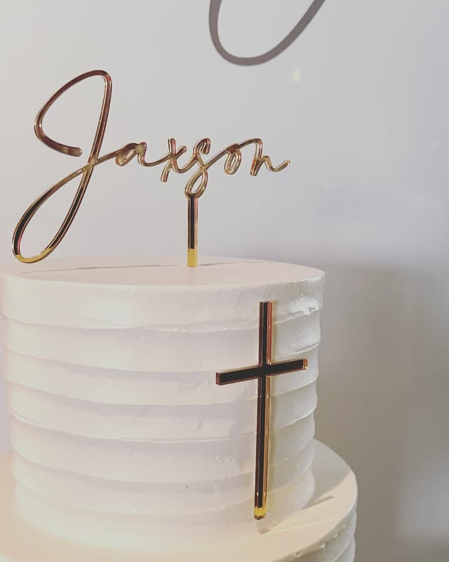 An elegant and sophisticated adornment for your sacrament cake, this single layer cake topper set makes a beautiful addition to your celebration. Featuring a single line of text in a font and colour of your choice, with optional 4" tall cross. The stake can be carefully cut off of non-mirrored acrylic using a small toothed handsaw so that the top portion can be affixed to a photo album or scrapbook after your event.