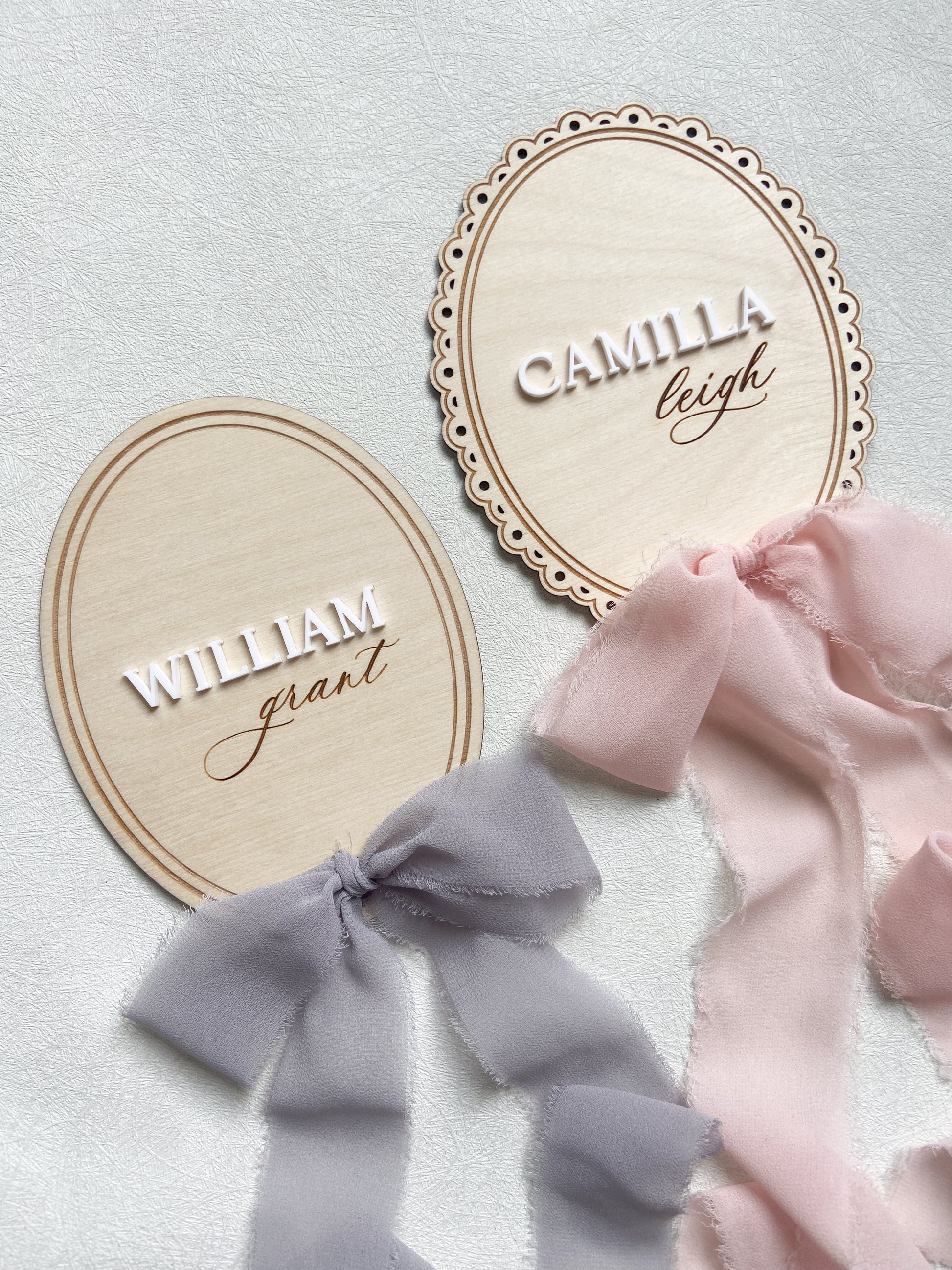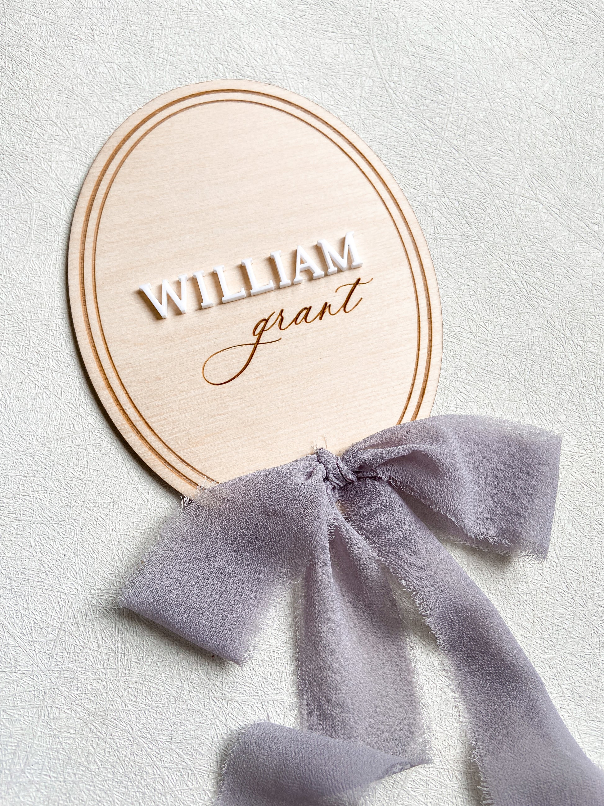 Introduce your little one in the sweetest way with this elegant baby name announcement. Designed with a timeless, simple engraved border, this 6" baby name announcement plaque features a laser-cut acrylic first name, paired with a delicately engraved middle name, and a charming ribbon accent that is the perfect way to celebrate your baby's arrival.