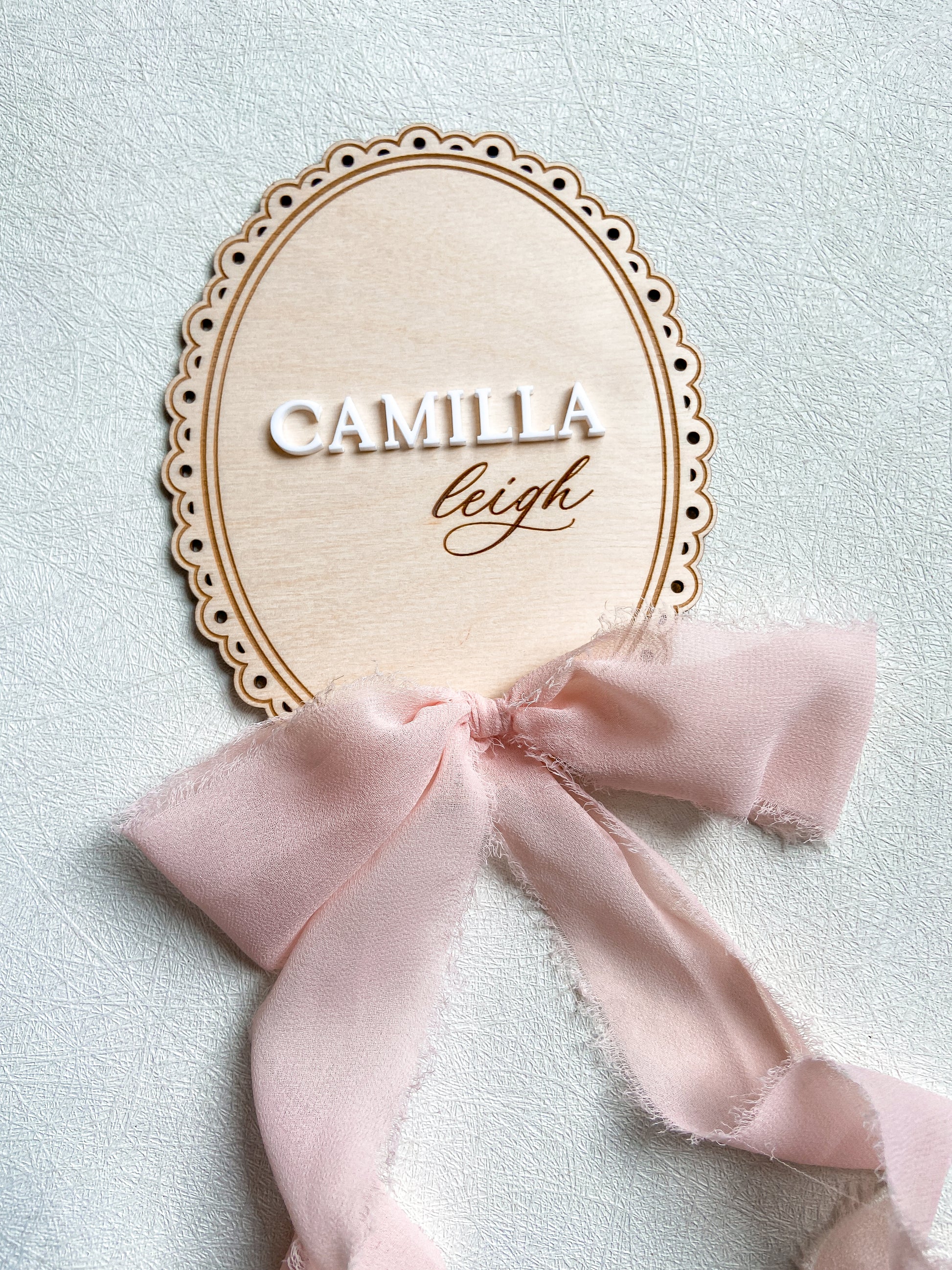 Wood Baby Name Announcement with Ribbon - Scalloped Edge